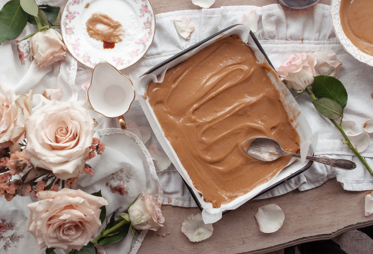 This version includes a silky raw caramel layer that’s gently strengthened with a portion of the base. The result is a bar that slices cleanly and feels extra luxurious — perfect for gatherings or special afternoons.