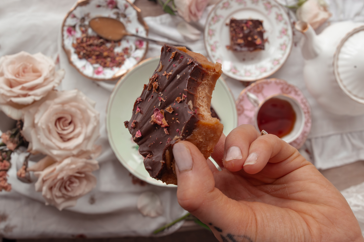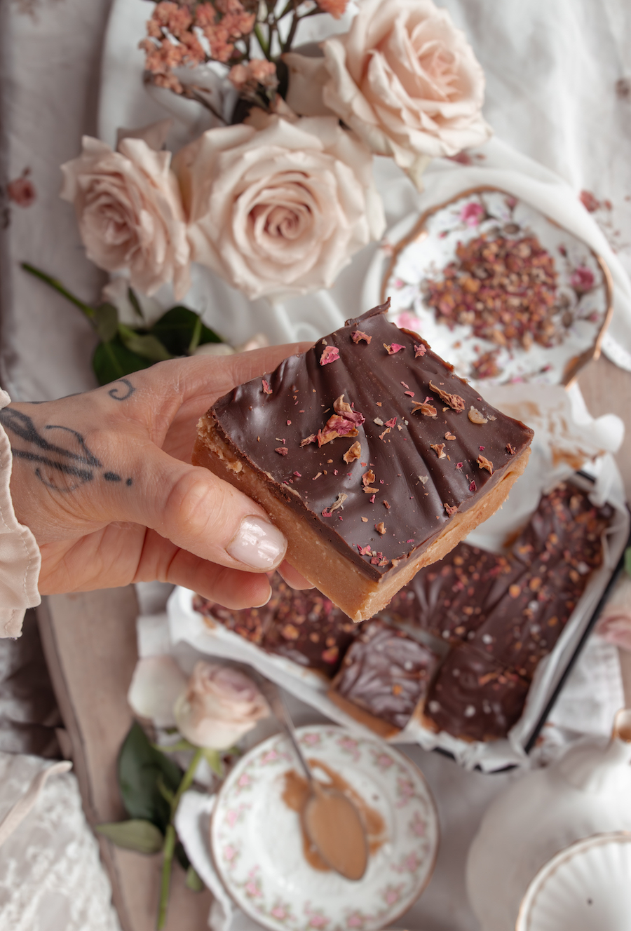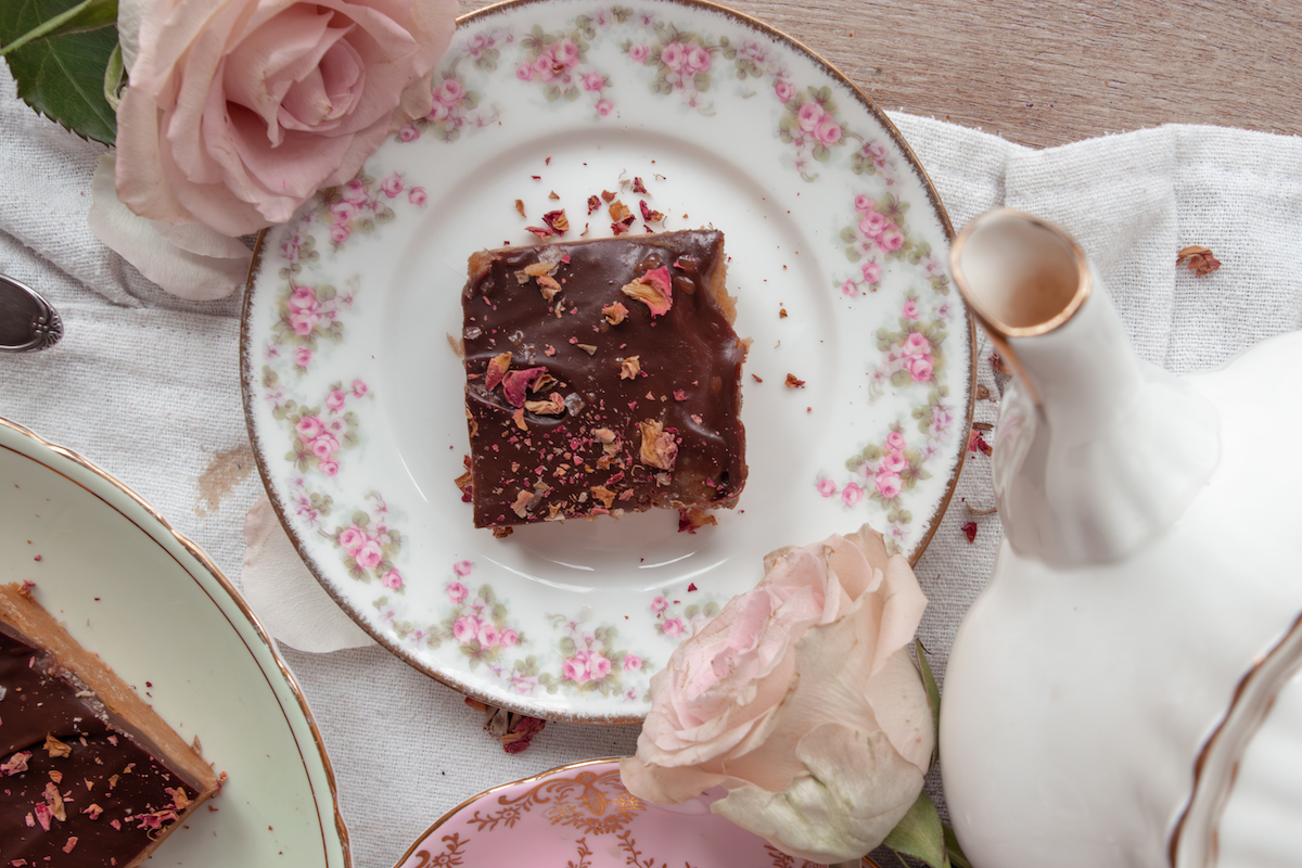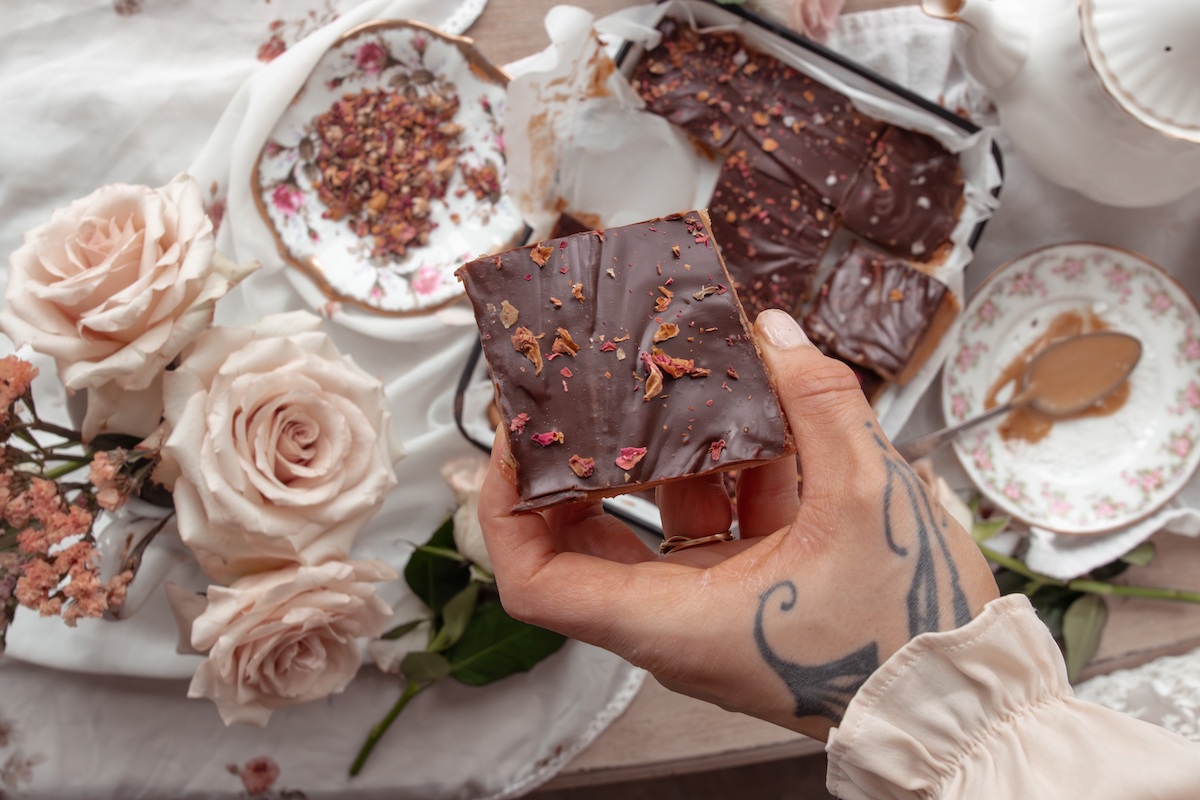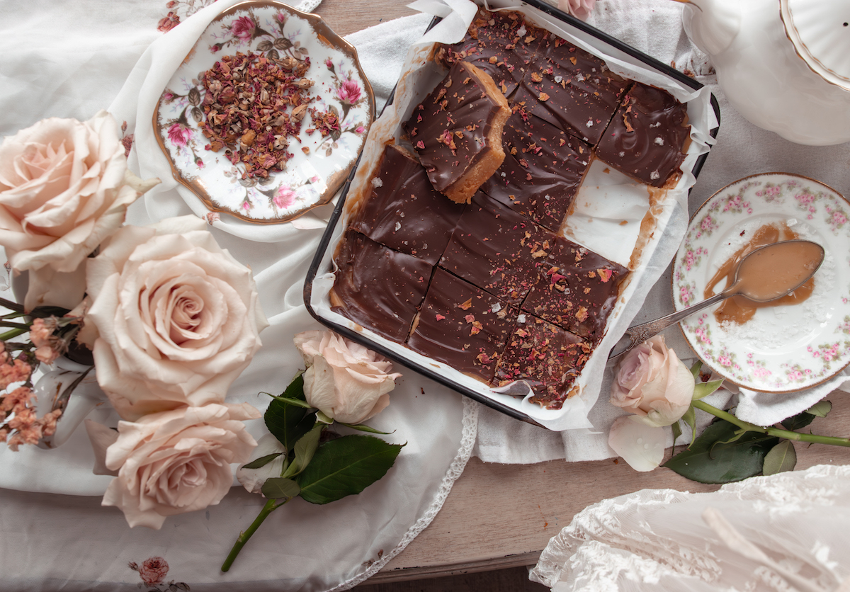 Pour the chocolate topping over the caramel layer and gently spread to the edges. While still warm, sprinkle with flaky sea salt and a light scattering of dried rose petals.