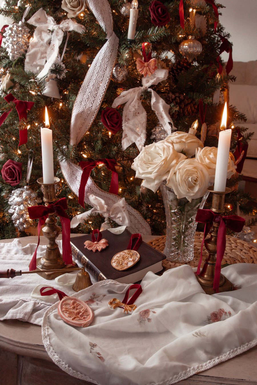 Drape scarlet velvet ribbon through your tree branches. Tie ruffly bows onto wreaths, banisters, and gift parcels. Tuck in dried or faux roses for a poetic flourish. These details feel luxurious yet deeply traditional — a celebration of beauty for beauty’s sake.